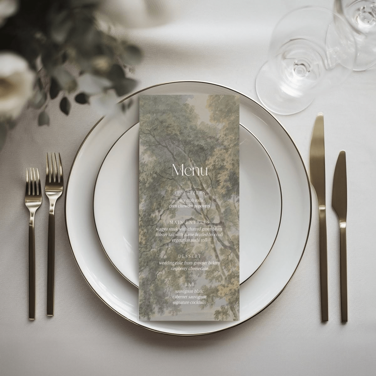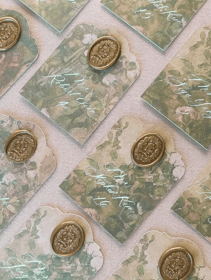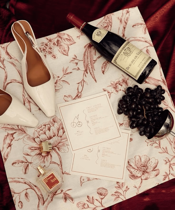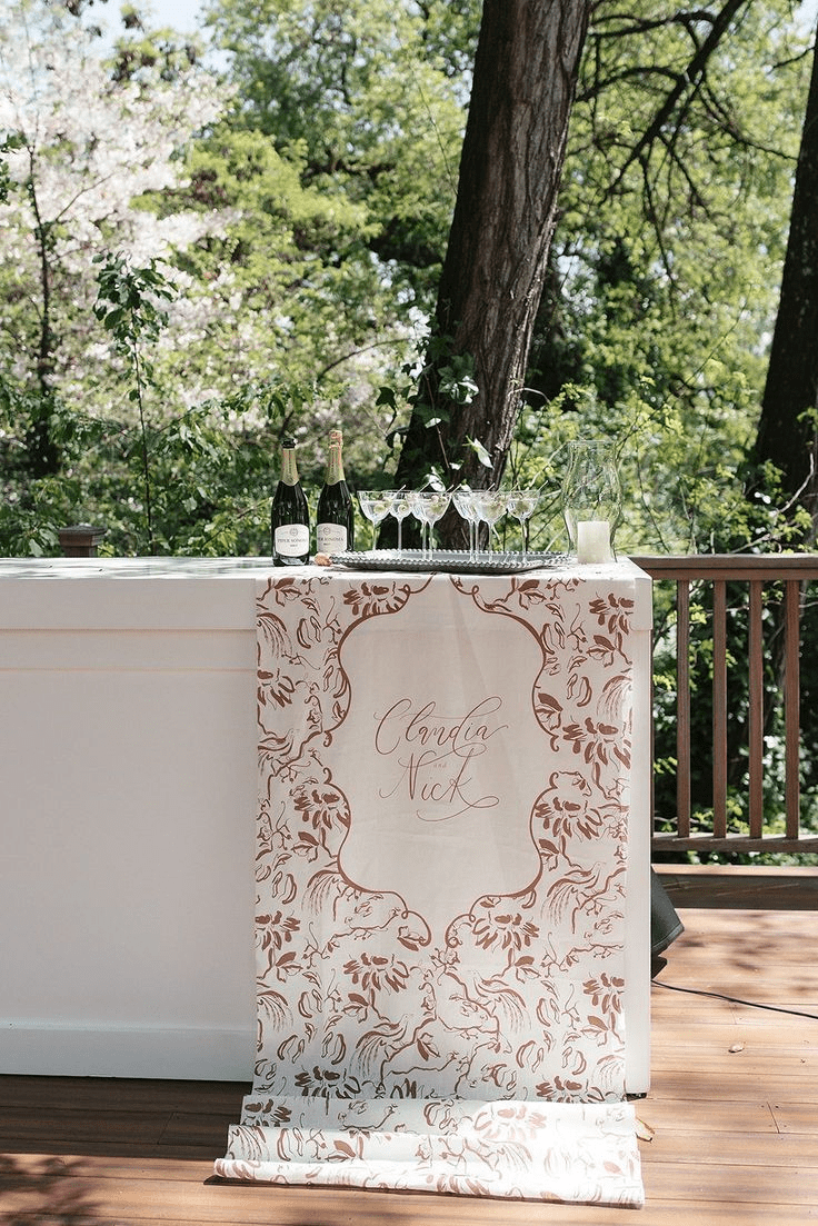 - У торці столу драпіруємо скатертину (підіймаємо та закріплюємо) та випускаємо з-під неї принтований шматок текстилю, яким видовжуємо стіл. Тканинка може бути підібрана під принт на запрошеннях або ж з французьким вінтажним принтом, схожим на той, що на тарілках