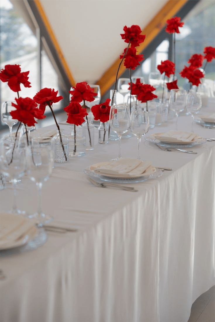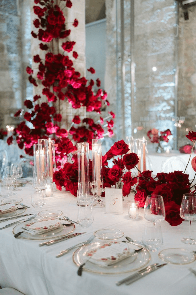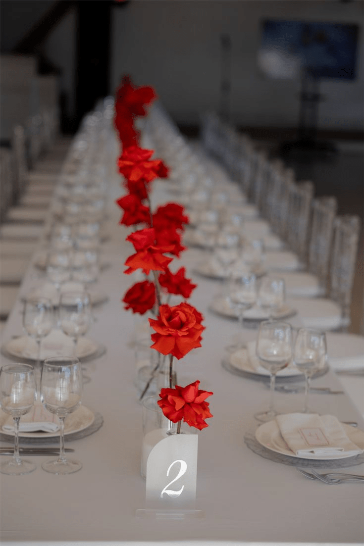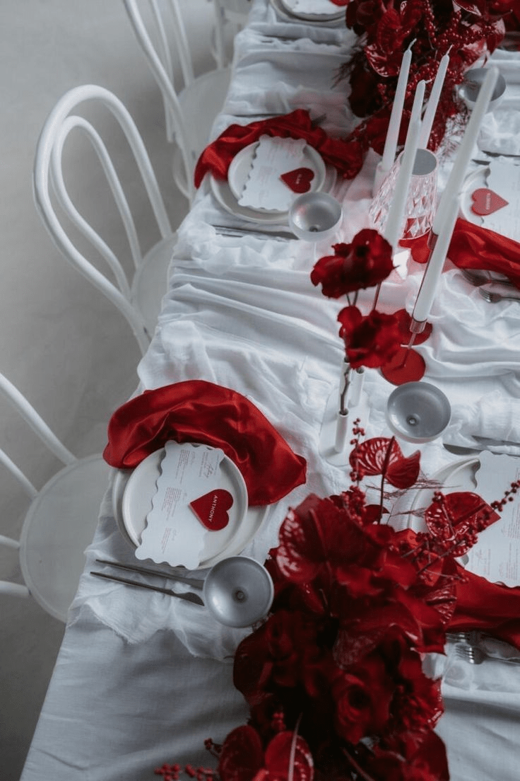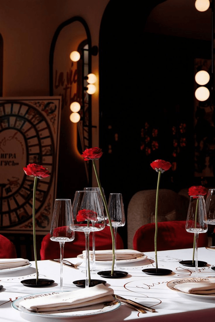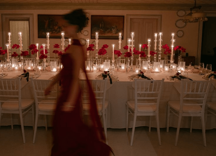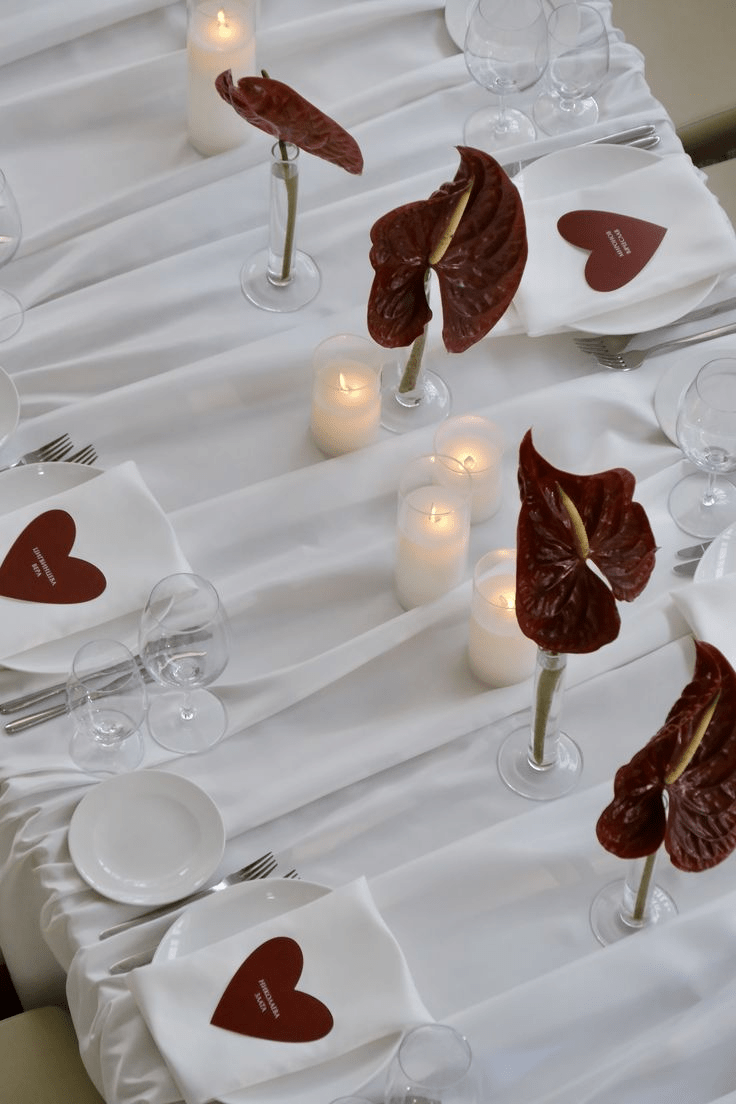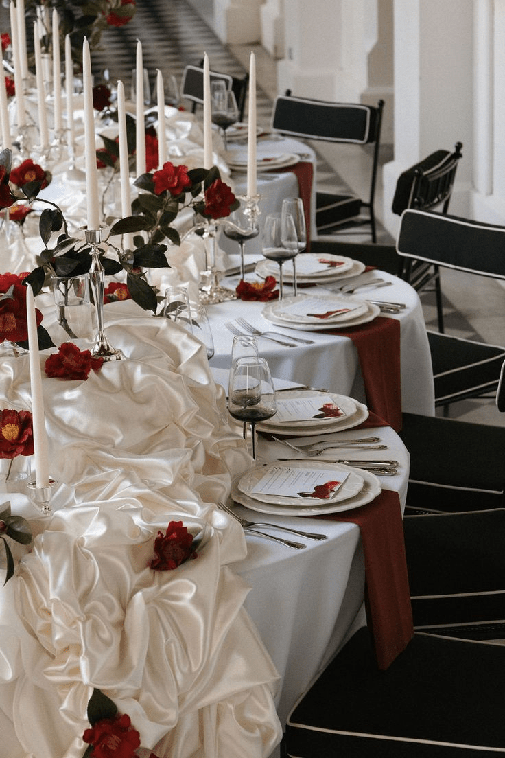 по центру столу блискуча тканинка (у меншій кількості ніж на рефі)