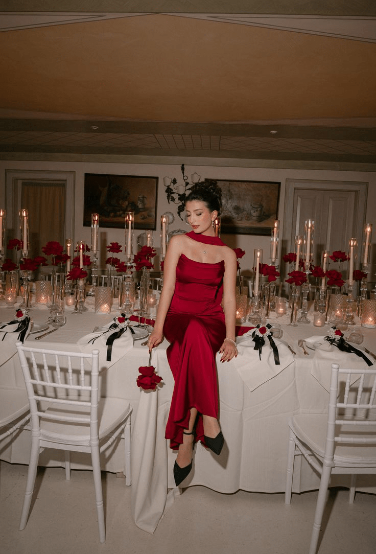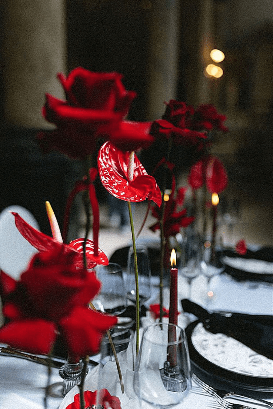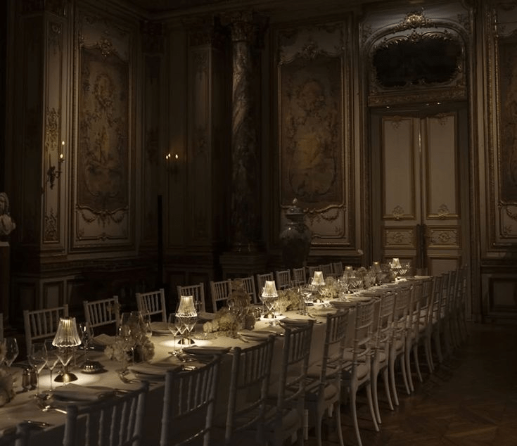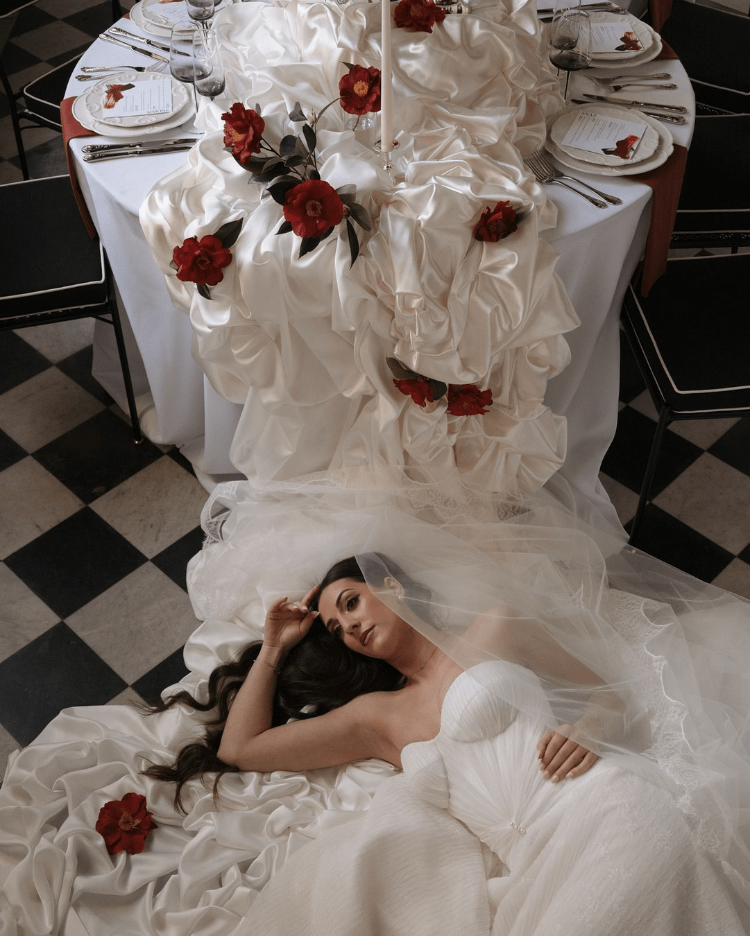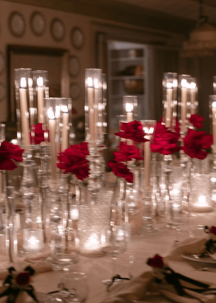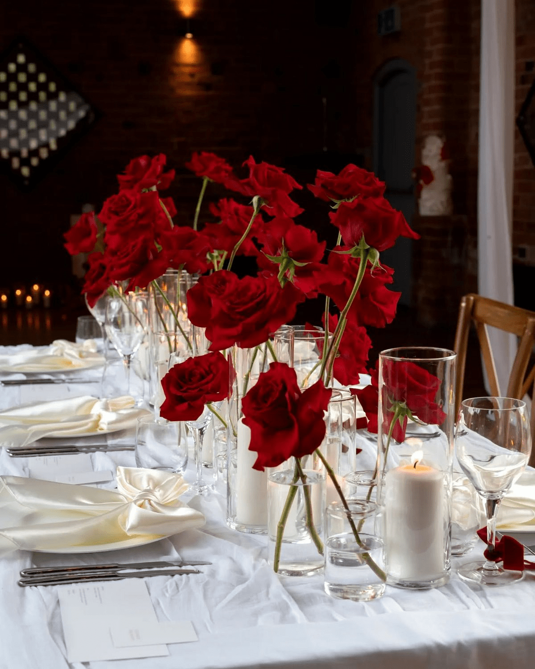 по центру столу блискуча тканинка (у меншій кількості ніж на рефі)