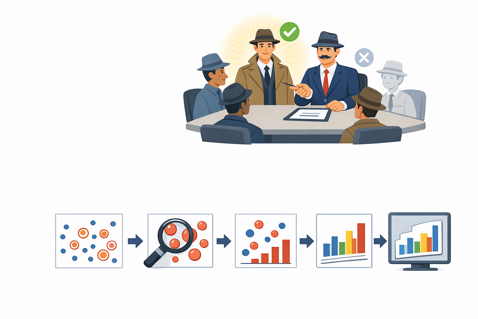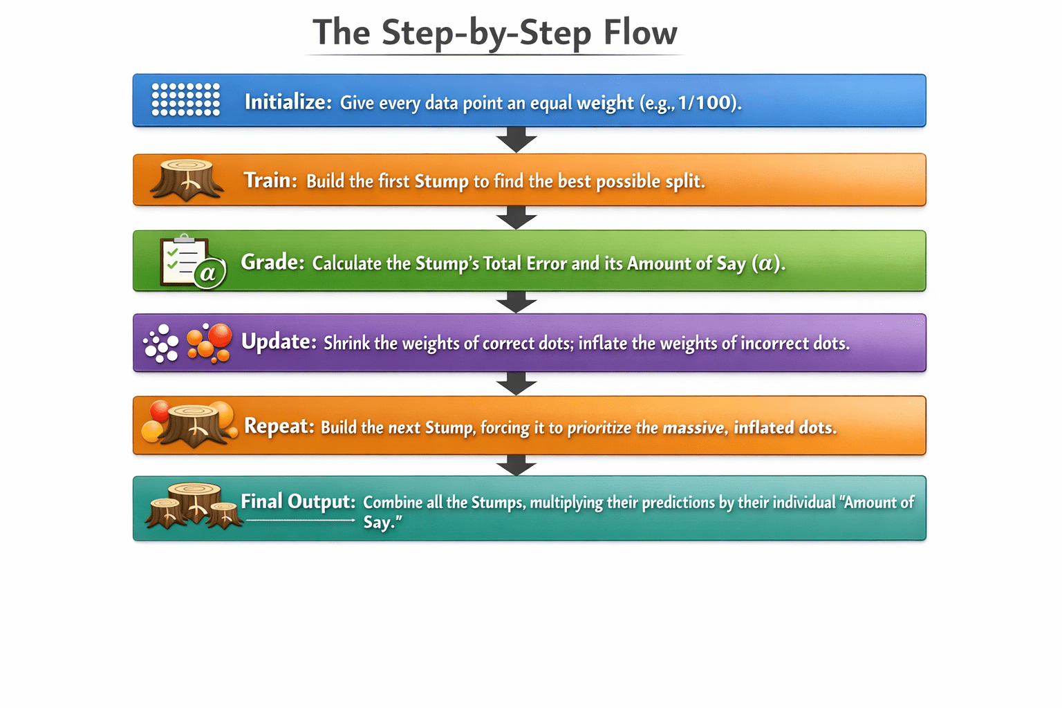 This is AdaBoost! It forces new models to focus on the "red circles" (errors) and weighs their final votes based on their individual accuracy.