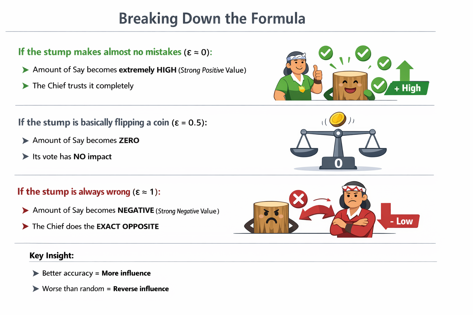 If the stump makes almost no mistakes (ε approx 0), its Amount of Say skyrockets to a massive positive number. (The Chief trusts it!).