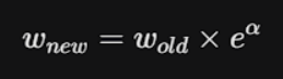 Wrong answers are multiplied by e^{α}, making them HEAVIER for the next stump