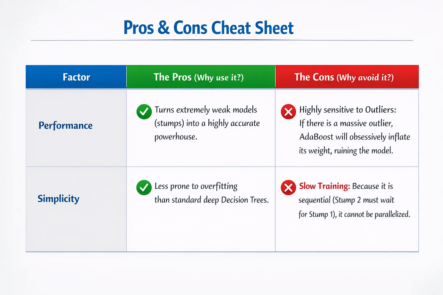 Slow Training: Because it is sequential (Stump 2 must wait for Stump 1), it cannot be parallelized.