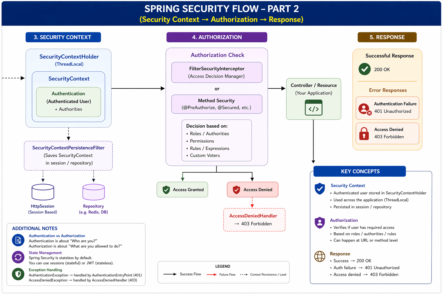 To handle this, Spring Security uses a SecurityContext, which stores the Authentication object. This allows other parts of the application to access the details of the currently authenticated user.