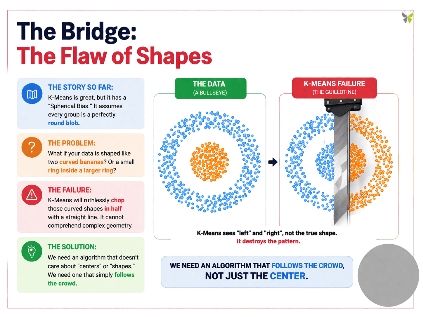 K-Means is great, but it has a "Spherical Bias." It assumes every group is a perfectly round blob.