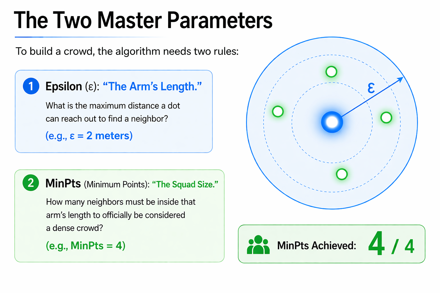 It requires two parameters: $\epsilon$ (reach radius) and MinPts (minimum neighbors).