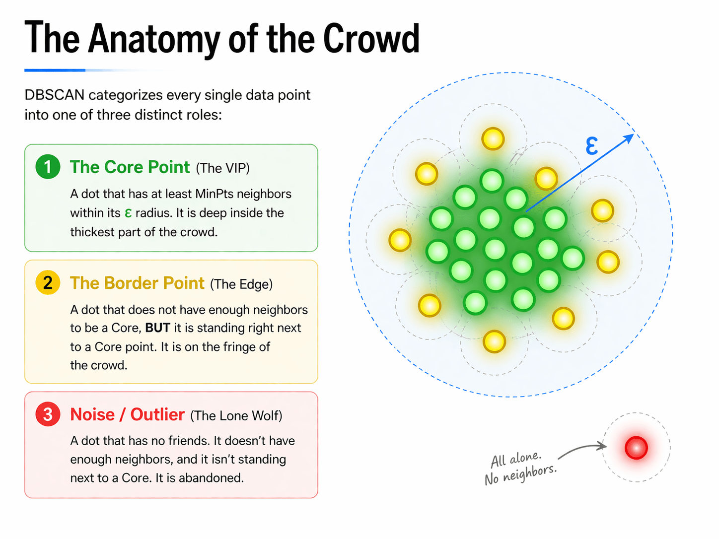 DBSCAN categorizes every single data point into one of three distinct roles: