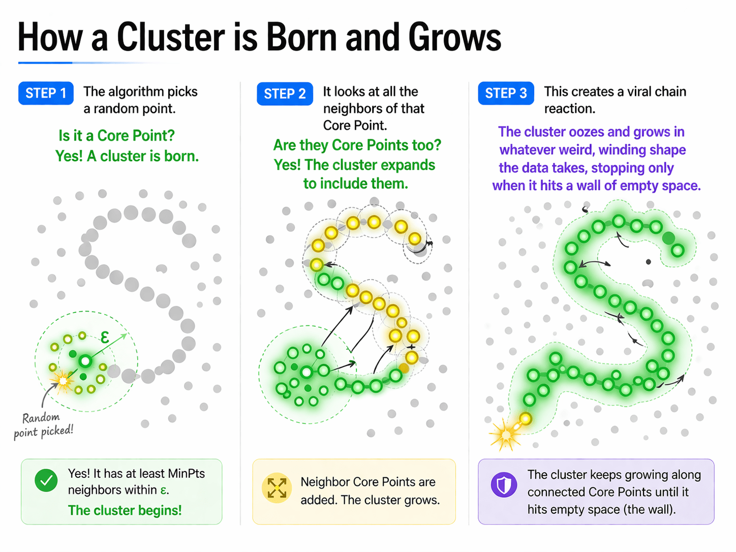The cluster oozes and grows in whatever weird, winding shape the data takes, stopping only when it hits a wall of empty space.