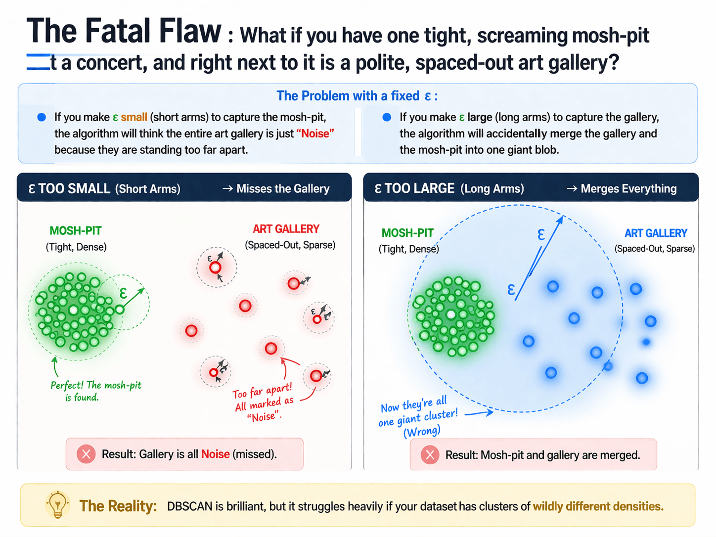 DBSCAN is brilliant, but it struggles heavily if your dataset has clusters of wildly different densities.