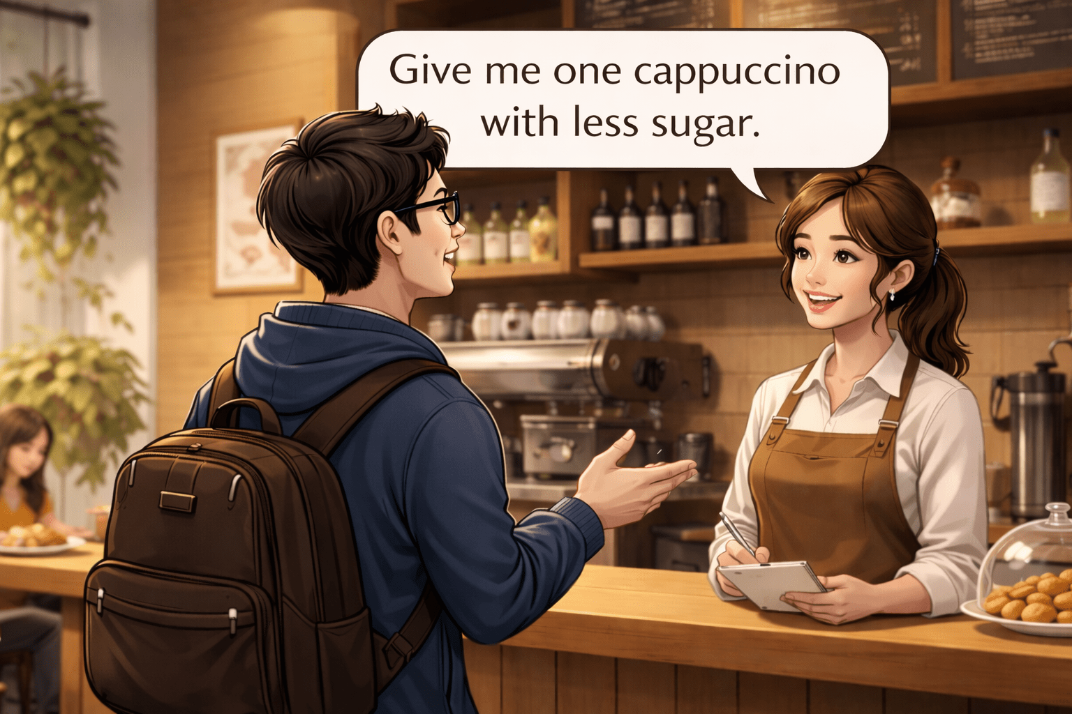 “Give me one cappuccino with less sugar.”