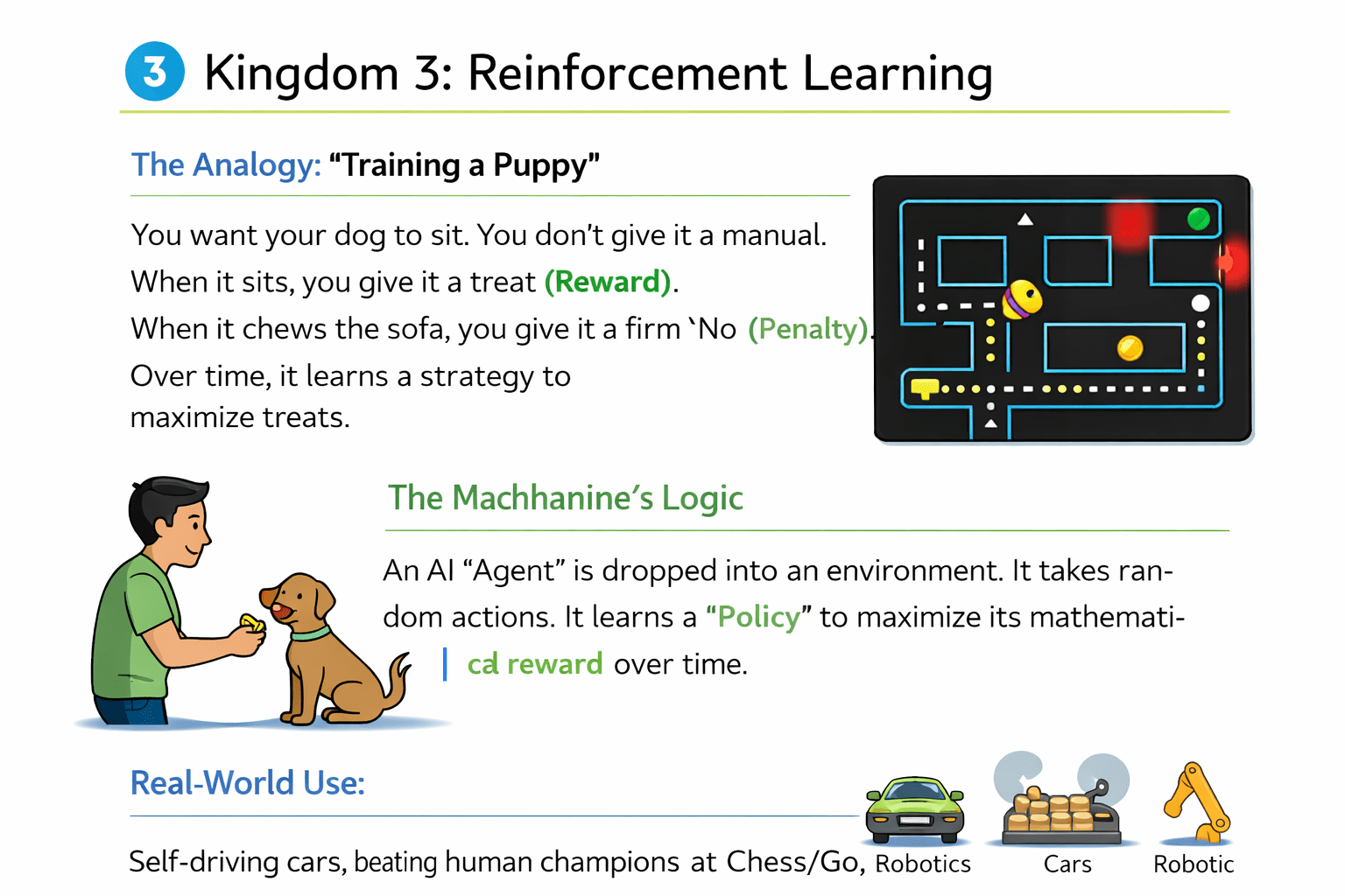 You want your dog to sit. You don't give it a manual. When it sits, you give it a treat (Reward). When it chews the sofa, you give it a firm "No" (Penalty). Over time, it learns a strategy to maximize treats.