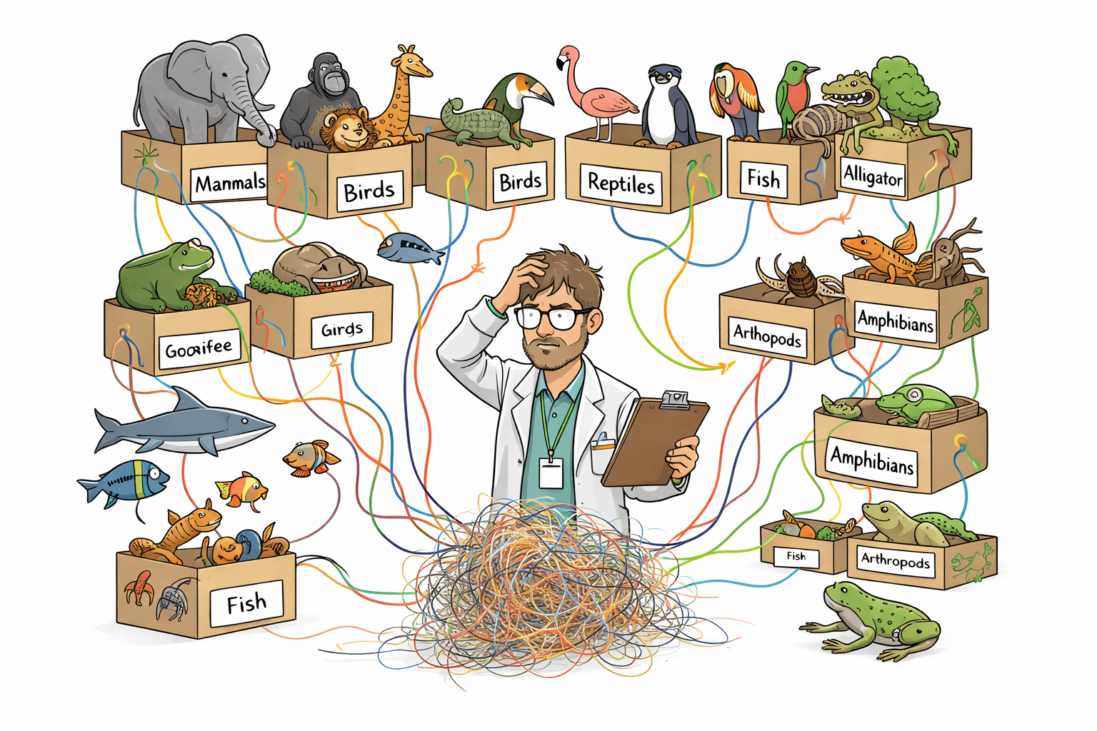 You merge Canines and Felines into "Mammals". You repeat this until every living thing is grouped under one giant label: "Animals".