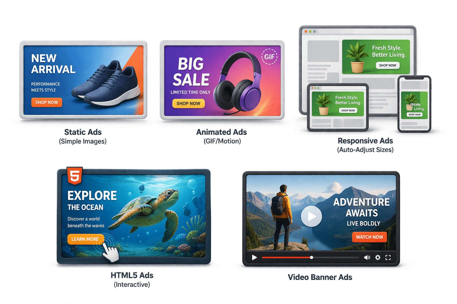 Banner ads are image-based display ads that appear on websites, apps, and platforms like YouTube. They use visuals, text, and a call-to-action to grab attention and drive users to a landing page.