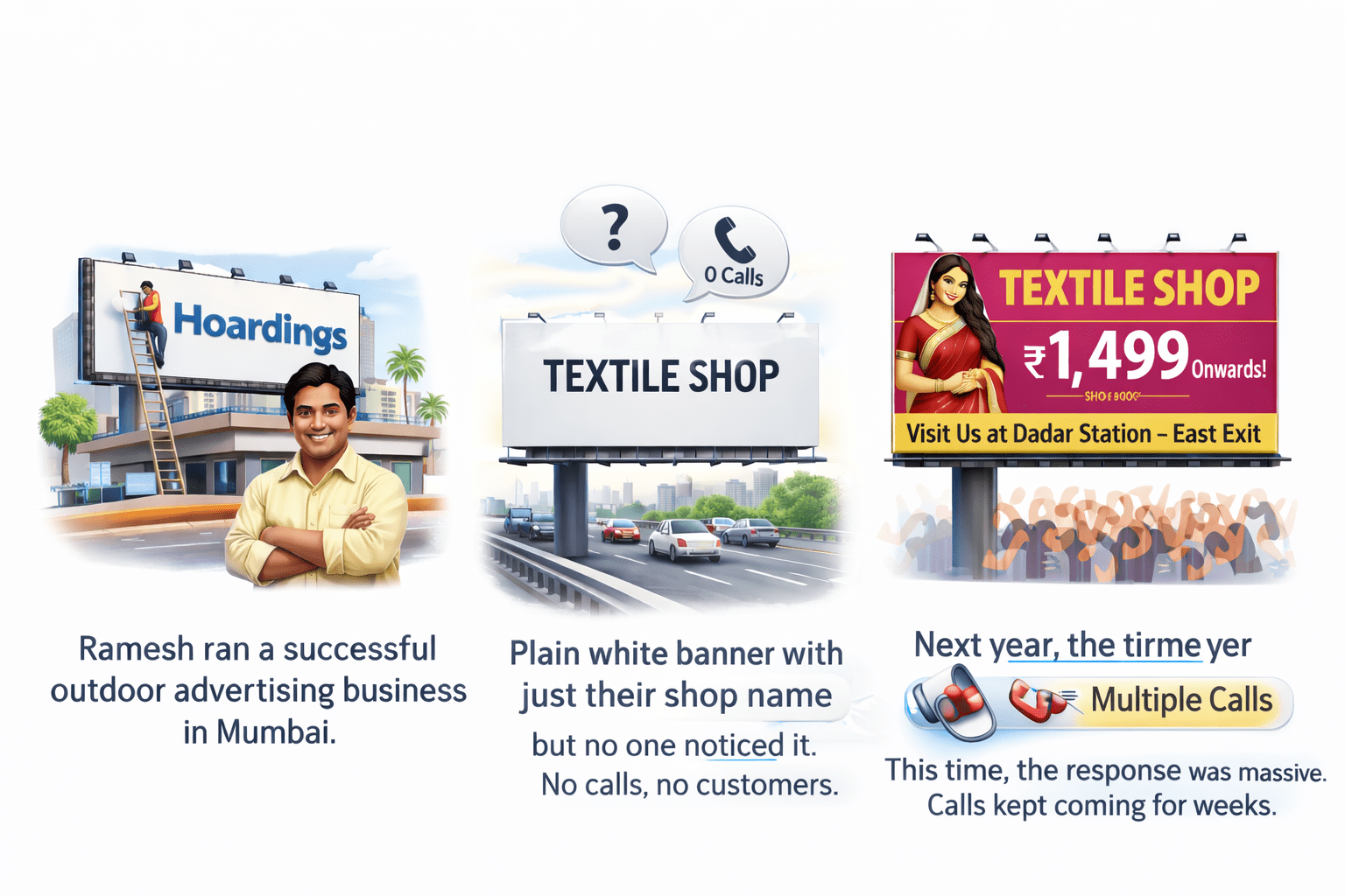 One day, a textile shop gave him a plain white banner with just their shop name. It was placed on a busy highway — but no one noticed it.