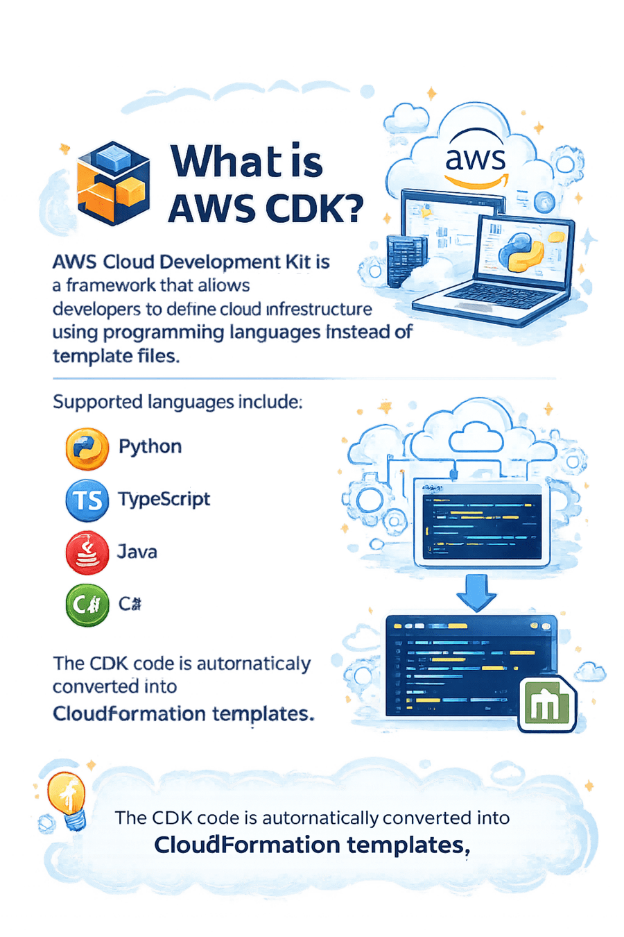 AWS Cloud Development Kit is a framework that allows developers to define cloud infrastructure using programming languages instead of template files