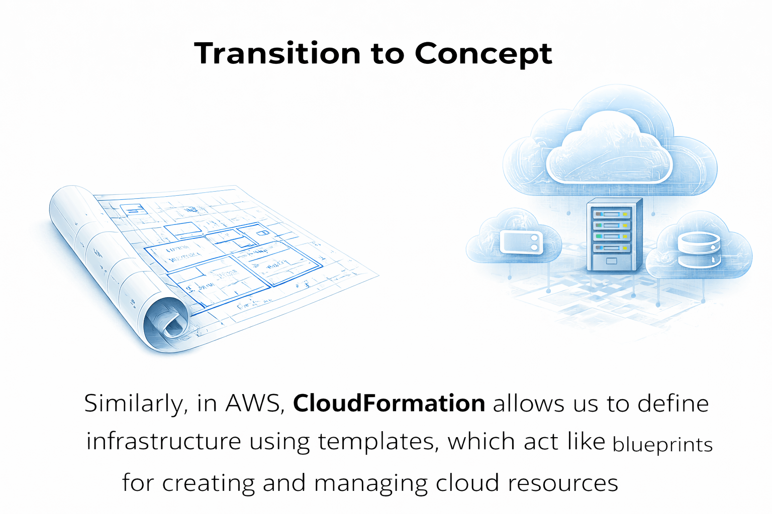 Similarly, in AWS, CloudFormation allows us to define infrastructure using templates, which act like blueprints for creating and managing cloud resources