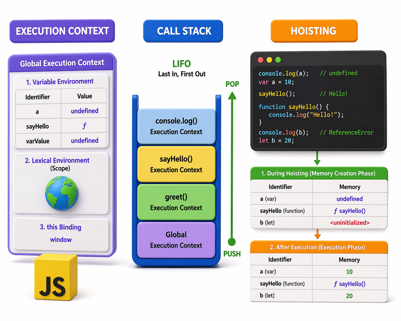 When the JavaScript engine starts running a script file, it automatically creates a default environment called the Global Execution Context.