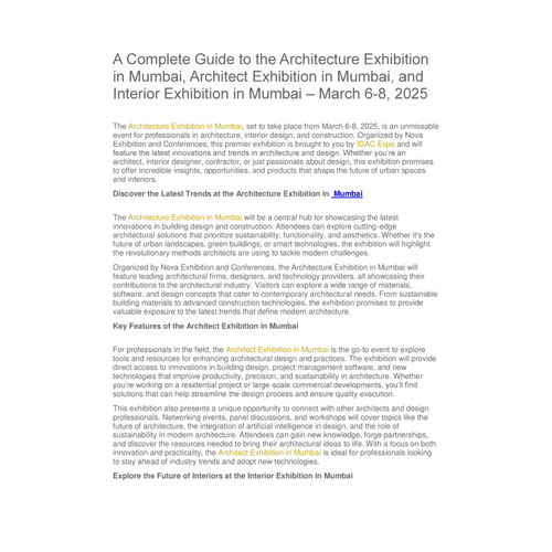The Architecture Exhibition in Mumbai, set to take place from March 6-8, 2025, is an unmissable event for professionals in architecture, interior design, and construction. Organized by Nova Exhibition and Conferences, this premier exhibition is brought to you by IDAC Expo and will feature the latest innovations and trends in architecture and design. Whether you’re an architect, interior designer, contractor, or just passionate about design, this exhibition promises to offer incredible insights, opportunities, and products that shape the future of urban spaces and interiors.