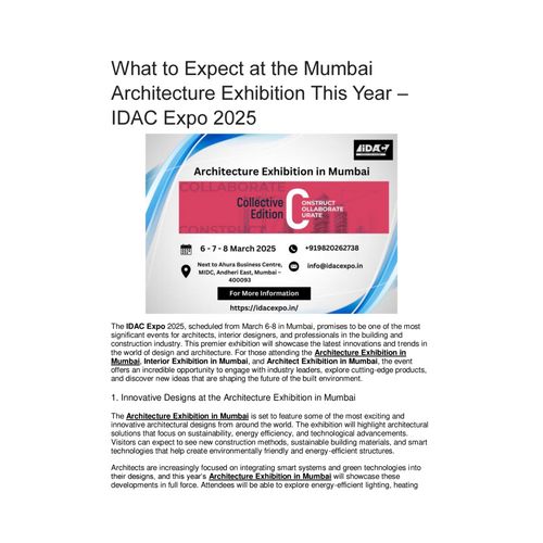 The IDAC Expo 2025, scheduled from March 6-8 in Mumbai, promises to be one of the most significant events for architects, interior designers, and professionals in the building and construction industry. This premier exhibition will showcase the latest innovations and trends in the world of design and architecture. For those attending the Architecture Exhibition in Mumbai, Interior Exhibition in Mumbai, and Architect Exhibition in Mumbai, the event offers an incredible opportunity to engage with industry leaders, explore cutting-edge products, and discover new ideas that are shaping the future of the built environment.