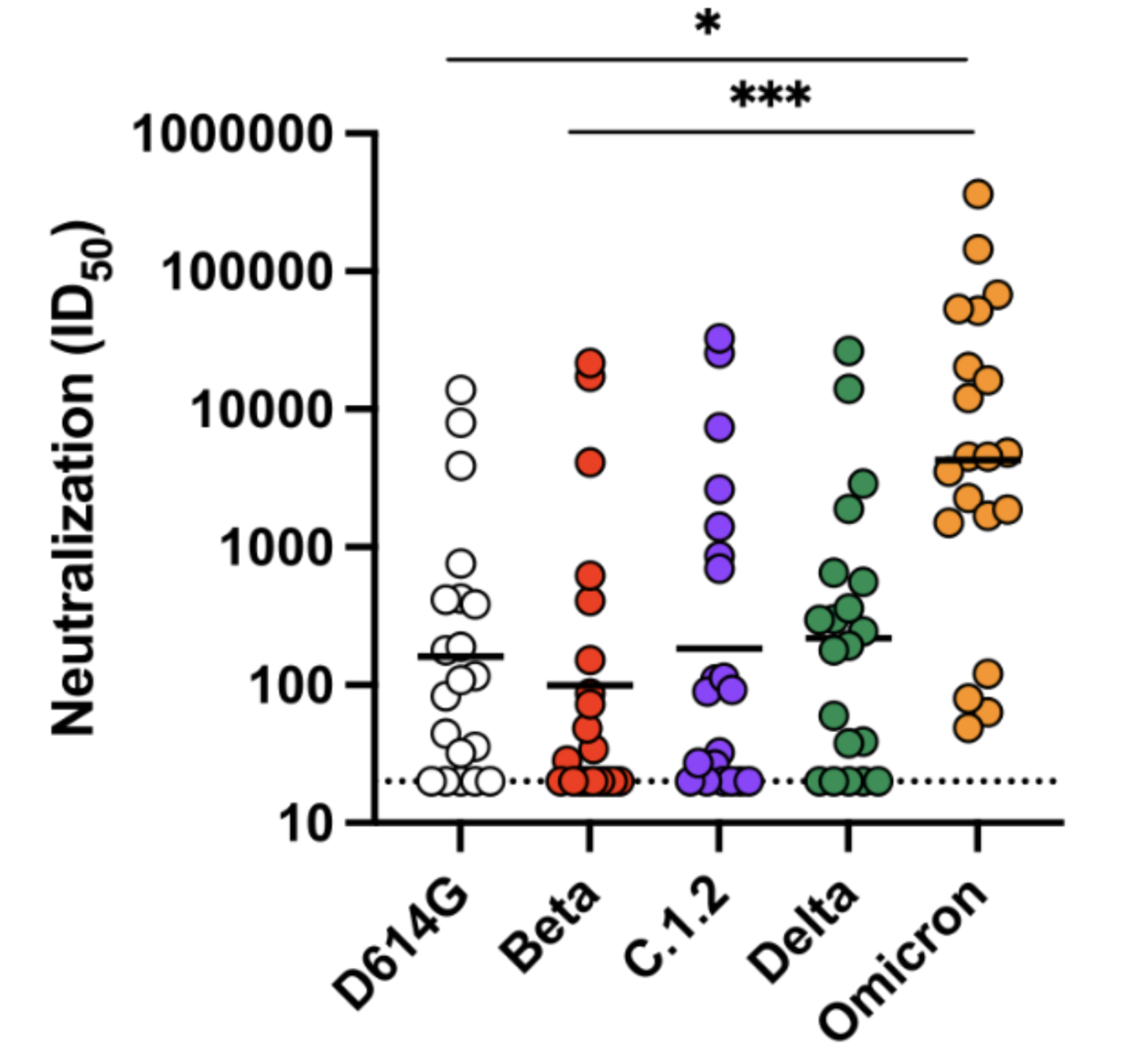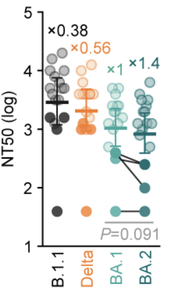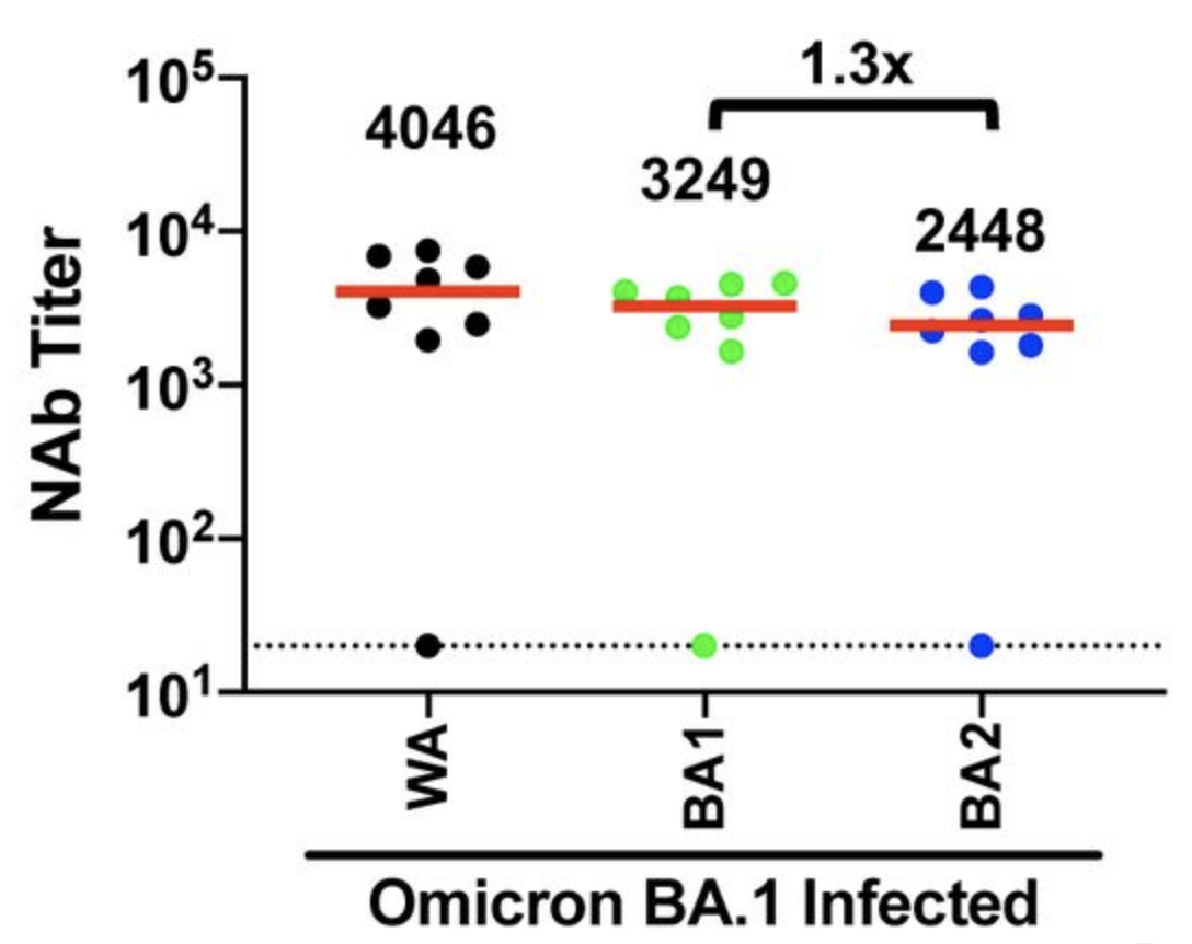 Humans vaccinated with current vaccines then infected with Omicron BA.1 neutralize Omicron BA.1 and BA.2 comparably to Delta and older Wuhan-Hu-1-like viruses
