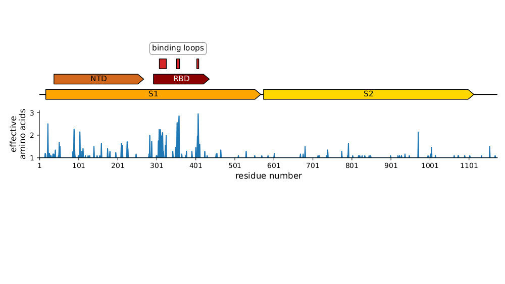 Escape map from one antibody (LY-CoV555, ie bamlanivimab). Peaks indicate sites where mutations escape binding.