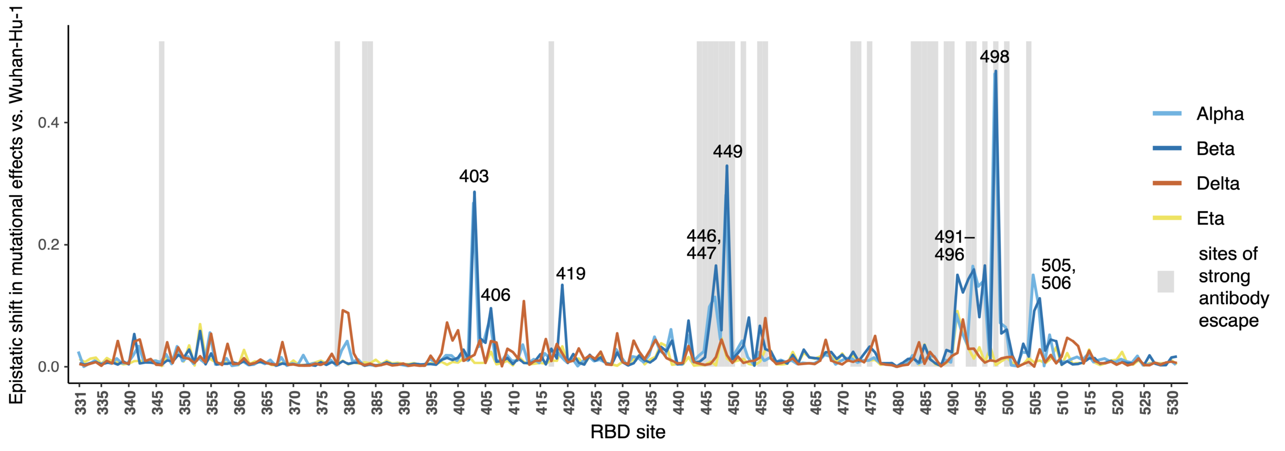 Alpha and Beta (which both have N501Y) but not Delta or Eta have major shifts in mutational effects relative to Wuhan-Hu-1.