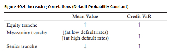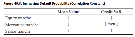 - Mezzanine tranches: Mixed effect—VaR increases at low correlation levels (like senior), decreases at high correlation levels (like equity)