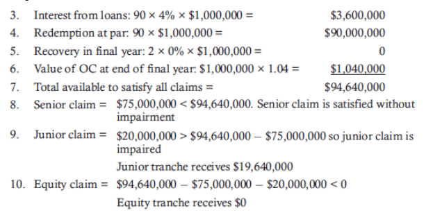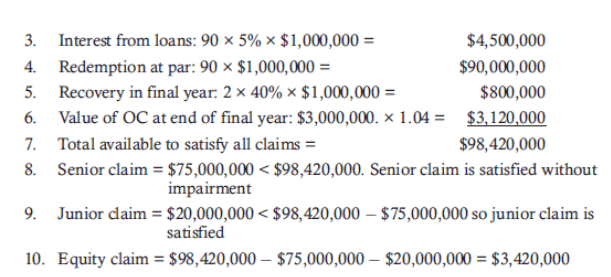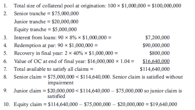 Example 1: Determine the terminal cash flows to senior, junior, and equity tranches given the following information. The original loan pool included 100 loans with $1 million par value and a fixed coupon of 8%. The number of surviving loans is 90. The par for the senior and junior tranches is 75% and 20%, respectively. The equity investors contributed the remaining 5%. There were two defaults with recovery rate of 40% recovered at the end of the period. The value of the trust account at the beginning of the period is $16million earning 4% per annum.