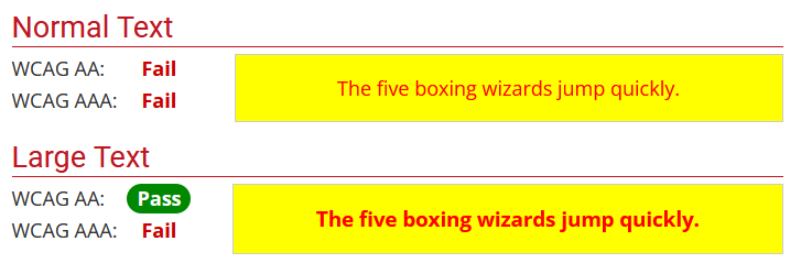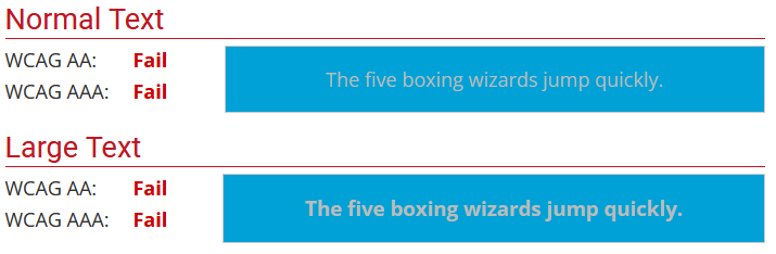 Conclusion : Contraste insuffisant pour le texte normal au niveau AA et AAA, mais acceptable pour le niveau A.
