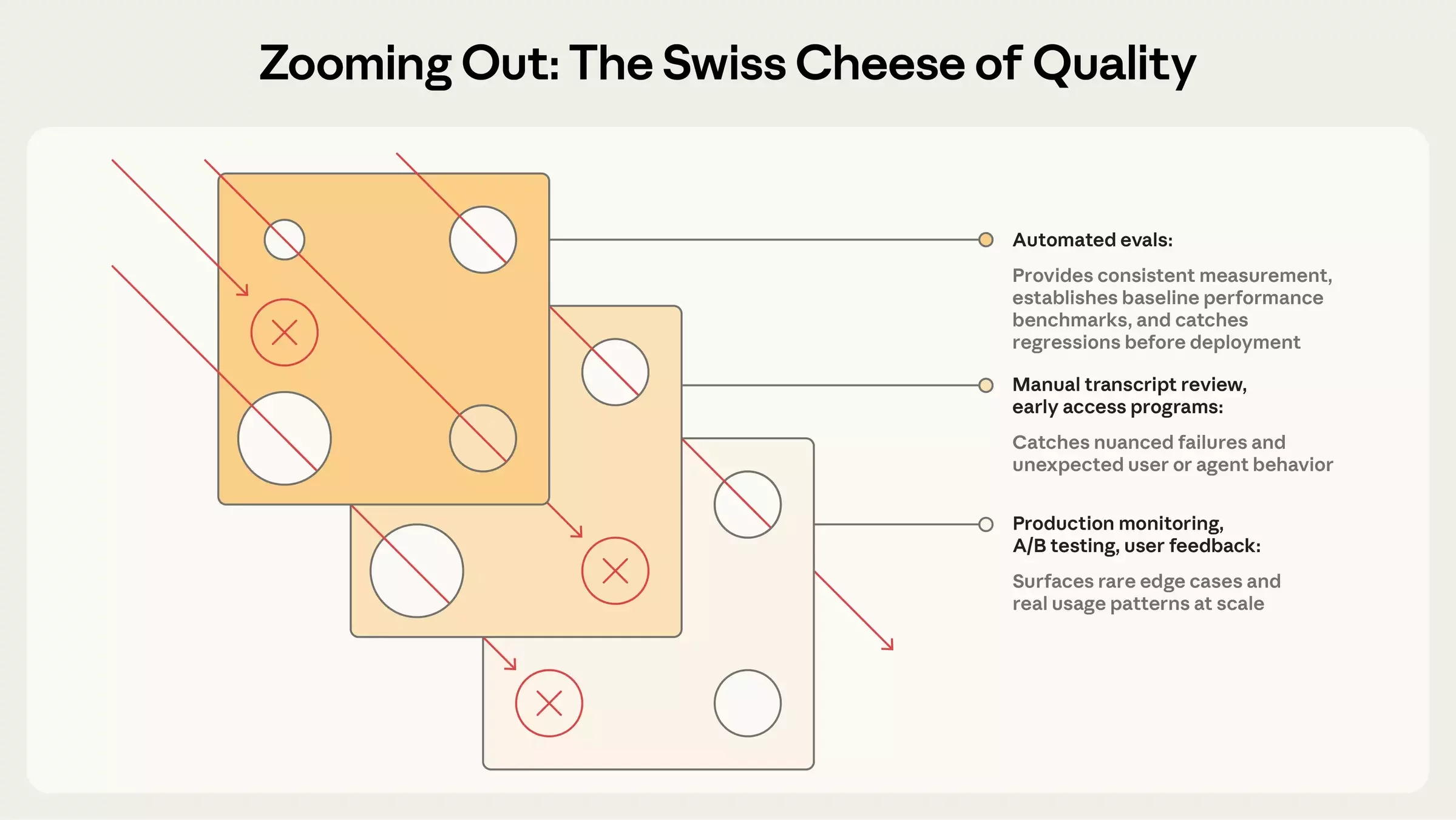 - Human review → novel failures, calibrating judges